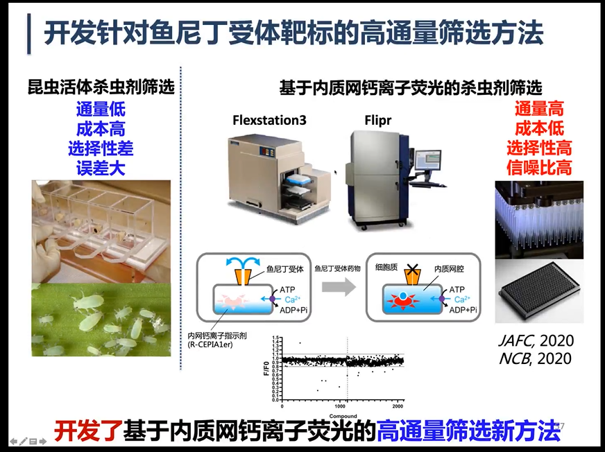 尉迟教授深入介绍了离子通道这一重要靶标在心脏和神经系统疾病方面的应用以及昆虫离子通道的研究进展,并着重阐述了鱼尼丁受体作为杀虫剂靶标的研究应用。尉迟教授第一部分从杀虫剂作用原理出发,首先介绍了鱼尼丁受体作为细胞内信号整合器可以控制肌肉收缩,其次通过冷冻电镜解析了主流杀虫剂、候选杀虫化合物与鱼尼丁受体结合的复合物蛋白结构,从而揭示了双酰胺激活鱼尼丁受体的分子机制—双酰胺结合诱导Arg4563构象变化;随后第二部分介绍了杀虫剂产生抗药性的机制即新发现的鱼尼丁受体抗性突变对靶标结构和功能的影响及其发生规律;第三部分介绍了针对鱼尼丁受体靶标的高通量筛选方法—基于内质网钙离子荧光的杀虫剂筛选,该方法通量高、成本低、选择性高、信噪比高。最后介绍杀虫剂的开发可以利用杀虫剂复合物结构和抗性鱼尼丁受体结构开发针对新一代鱼尼丁受体靶标的绿色杀虫剂。