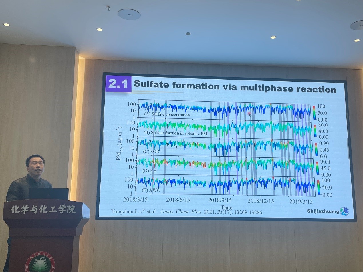 2023年03月23日下午,由北京理工大学研究生院主办,化学与化工学院承办的北理工“21世纪学科前沿”系列讲座在生态楼118会议室举行。应化学与化工学院张秀辉教授的邀请,北京化工大学刘永春教授做了题为“二次气溶胶生成的多相化学过程”的精彩学术报告。三十余名师生参加了讲座并进行学术交流。