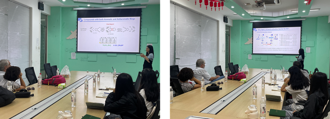 8月28下午,化学与化工学院的谢静教授向Dolg教授一行介绍了她们团队的部分研究工作。谢静教授首先介绍了自己在明尼苏达大学(University of Minnesota)博士后期间关于锕系化合物键合性质的系列工作;随后介绍了当前科研团队围绕金属化合物在气相小分子活化及均相/非均相催化领域的理论设计工作。报告结束后,谢静教授与Dolg教授、李全松教授等从金属-配体相互作用的角度深入探讨了重金属是否具备成为某些特定化合物中催化活性位点的潜力,交流气氛热烈,与会师生收获颇丰。