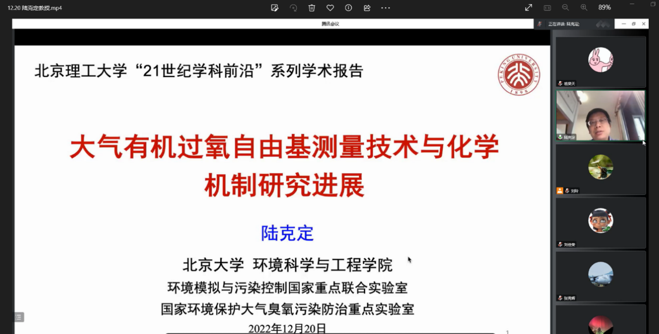 2022年12月20日上午,由北京理工大学研究生院主办,化学与化工学院承办的北理工“21世纪学科前沿”系列讲座在腾讯会议线上举行。应化学与化工学院张秀辉教授的邀请,北京大学陆克定教授做了题为“大气有机过氧自由基测量技术与化学机制研究进展”的学术报告。六十余名师生参加了讲座并进行学术交流。