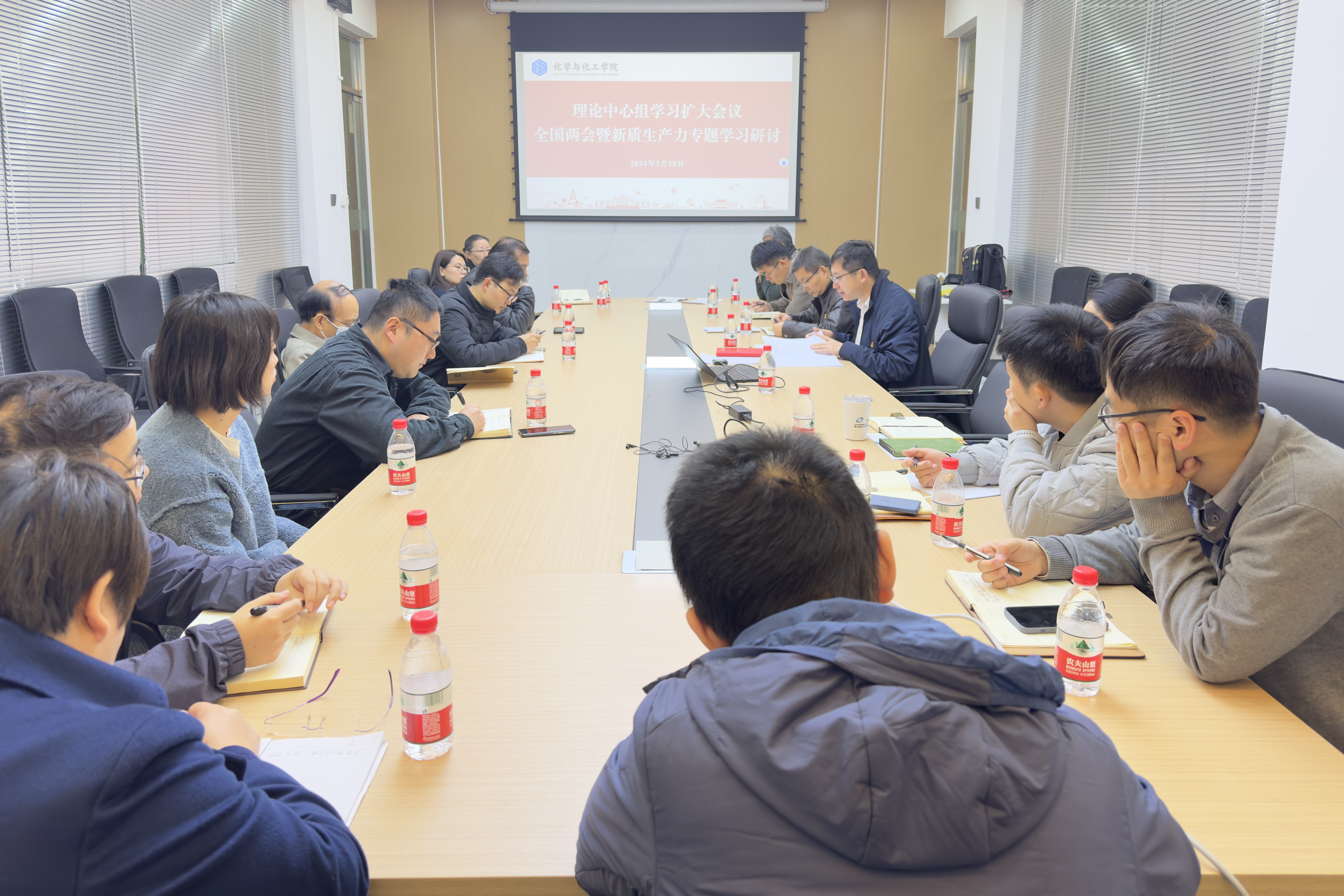 3月18日,化学与化工学院党委理论学习中心组开展扩大学习,第一时间传达学习习近平总书记在全国两会期间重要讲话精神和全国两会精神,深入学习习近平总书记关于发展新质生产力的重要论述,结合教育教学、人才培养、学科建设、科学研究、推动“双一流”高质量建设开展学习研讨。学院党委理论学习中心组成员、院长助理、党支部书记、研究所(中心)负责人参加学习。党委书记王振华主持学习。