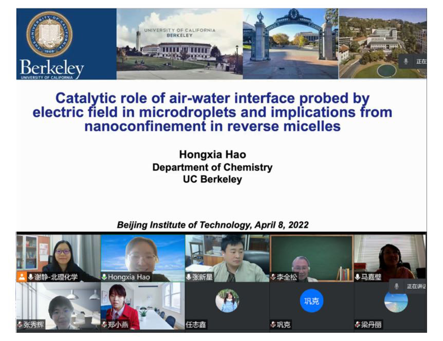 应北京理工大学化学与化工学院谢静教授邀请,美国加州大学伯克利分校的博士后郝红霞于2022年4月8日上午做客北理工“21世纪科学前沿”系列讲座,为我院广大师生带来题为“微滴中气-液界面的电场及其催化作用研究和反胶束中纳米限域影响的启示”的精彩报告。本次报告通过腾讯会议在线上举行,由谢静教授主持,北京理工大学化学与化工学院多名师生参与了此次报告。