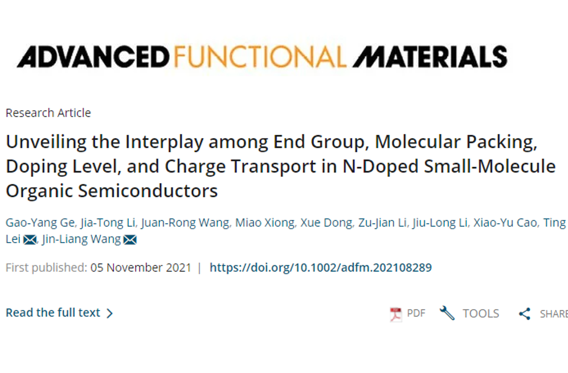相关成果以“Unveiling the Interplay among End Group, Molecular Packing, Doping Level, and Charge Transport in N-Doped Small-Molecule Organic Semiconductors”为题,发表在国际材料顶级期刊《Advanced Functional Materials》(2021, 31, 2108289)上。化学与化工学院博士生葛高阳和北京大学材料科学与工程学院博士生李佳桐为该论文的共同第一作者,化学与化工学院王金亮教授和北京大学雷霆研究员为共同通讯作者,论文的合作者还包括厦门大学的曹晓宇教授。该研究工作得到了国家自然科学基金面上项目、国家海外高层次青年人才计划、北京理工大学特立青年学者计划等项目的资助,以及北京市光电转换材料重点实验室、学校分析测试中心、上海同步辐射光源中心BL14B1线站的大力支持。