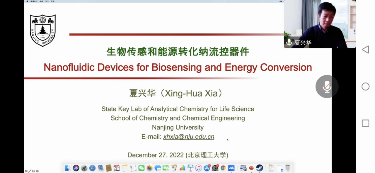 2022年12月27日上午,应北京理工大学化学与化工学院的邀请,南京大学夏兴华教授做了题为“生物传感和能源转化纳流控器件”的在线学术报告。