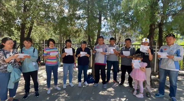 参观结束后,党员同志们在纪念碑前缅怀先烈,重温入党誓词,合唱歌曲“没有共产党就没有新中国”。
