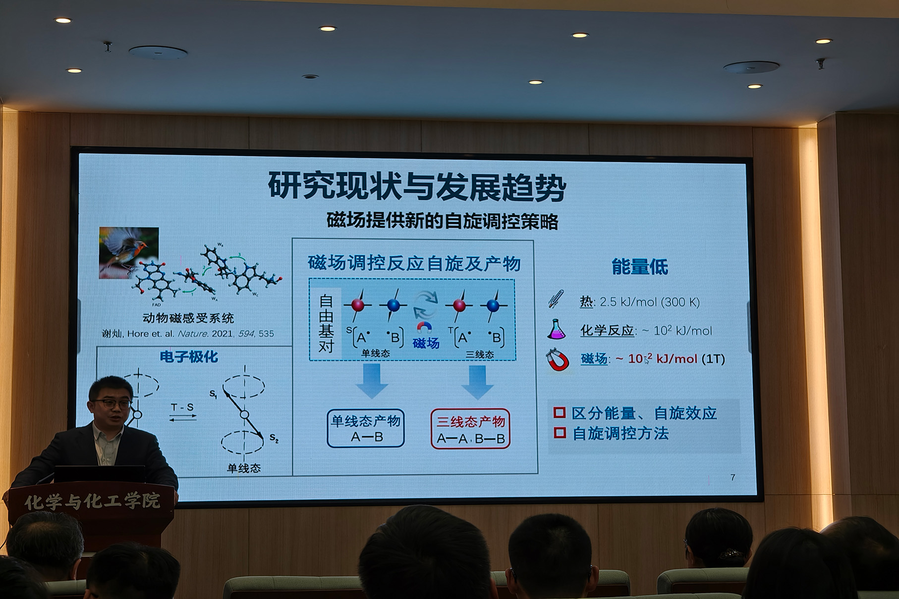 分子自旋催化基于自旋这一电子内禀属性,通过磁场、配体场等手段调控反应中间体或激发态的自旋态混合、自旋-轨道耦合效应,从而显著提高反应产率和选择性,成为催化科学原始创新的重要途径。氧气是自然界中唯一基态为三线态的分子,其自旋调控对反应的选择性和反应路径具有重要影响。张俊龙教授从磁场化学的历史出发,介绍氧自由基对模型并展示了磁场作为非侵入外场调控氧相关化学反应的潜力。张教授还深入探讨了光活化氧气,电子转移到磁场调控氧的自旋态演化的研究进展,重点介绍了磁场调控方面的最新成果。揭示了磁场调控氧化反应的新机遇。