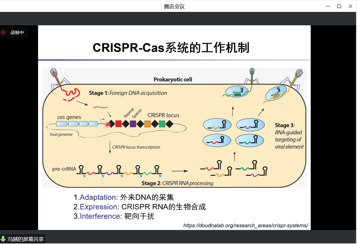 冯越,北京化工大学生命学院教授,博士生导师,国家优秀青年基金获得者(2018)。中国生物工程学会青年工作委员会委员,国家自然科学基金评审专家,北京市自然科学基金评审专家,中国生物物理学会会员,中国生物化学与分子生物学会会员。主要以结构生物学、生物化学以及细胞生物学等学科手段,从事病原与宿主互作的机制研究,先后发表SCI论文38篇,其中以通讯作者身份在《Nature》、《Nat. Chem. Biol.》、《Mol. Cell》、《Nat. Plants》、《Nat. Commun.》等杂志发表论文16篇。作为负责人主持国家及省部级项目多项。曾获得全国青年岗位能手(2020)、北京市优秀青年人才(2020)、北京市科学技术进步奖二等奖(2018)、中国十大新锐科技人物(2018)、北京市科技新星(2019)等荣誉。近年来系统研究了细菌CRISPR-Cas系统及噬菌体Anti-CRISPR蛋白的作用机制。本报告围绕细菌CRISPR-Cas系统及噬菌体Anti-CRISPR蛋白,分为两部分,分别详细阐述I-F型CRISPR-Cas系统的抑制蛋白抑制CRISPR-Cas系统的分子机制,以及III-E型CRISPR-Cas系统免疫功能的分子机制。