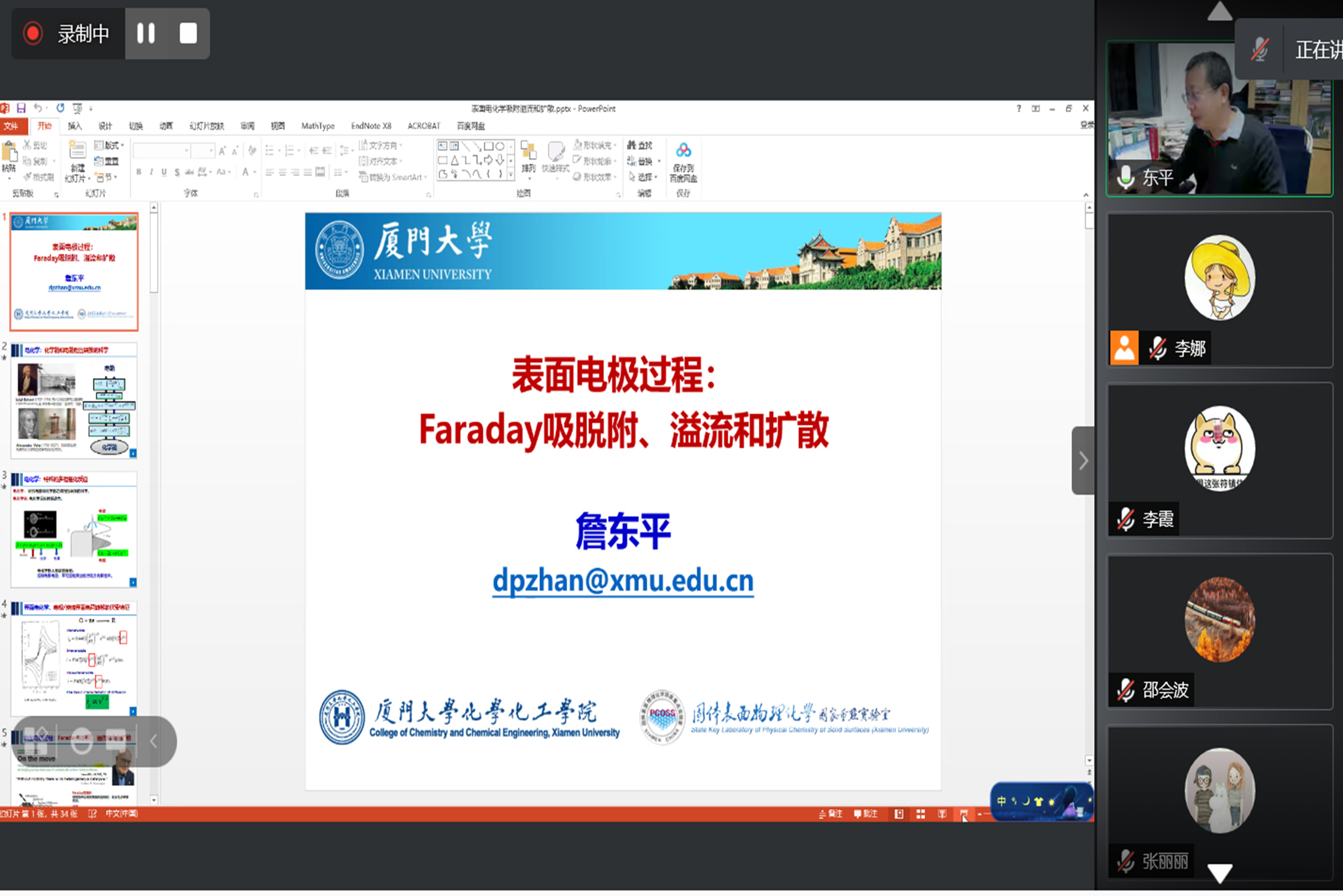 2022年1月7日晚19:30,应北京理工大学化学与化工学院邵会波教授的邀请,厦门大学化学化工学院詹东平教授做客北理工“21世纪学科前沿”系列讲座,为我院广大师生带来题为“表面电极过程:Faraday吸脱附、溢流和扩散”的精彩报告。本次报告以腾讯会议线上的方式举行,由邵会波教授主持,化学与化工学院多名师生参与了该学术报告。