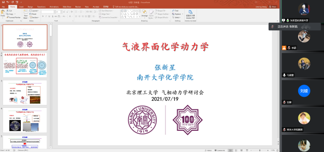 应北京理工大学化学与化工学院马嘉璧副教授邀请,中科院大连化物所袁开军研究员、南开大学张新星研究员、南京大学胡茜茜副教授、重庆大学勾茜教授于2021年7月19日上午8:30在腾讯会议线上分别作了题为“基于大连光源的水分子光化学研究” 、“气液界面化学动力学” 、“化学激光中传能过程的量子动力学研究” 、 “Rethinking π Interactions: Rotational stories”的精彩学术报告。报告由马嘉璧副教授主持,谢静教授及几十名同学参加了此次报告会。