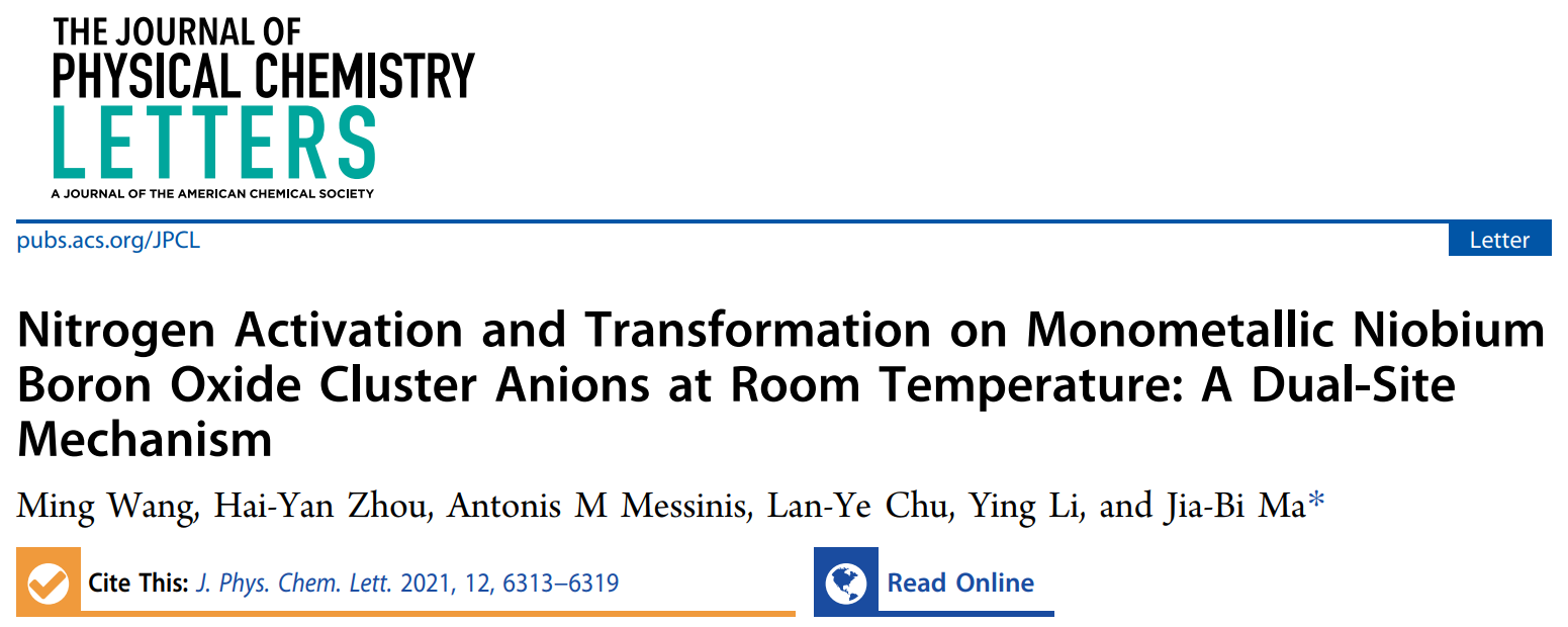 近日,北理工化学与化工学院马嘉璧副教授团队通过质谱实验和高精度量子化学计算对N2与NbB3O2−气相团簇的反应性及团簇结构进行了深入研究,成功构造了具有双活性位点的、含单个前过渡金属原子的N2催化剂,实现了室温下对N2的活化转化,其活化模式是金属—配体活化(Metal-Ligand Activation,MLA)。相关成果以“Nitrogen Activation and Transformation on Monometallic Niobium Boron Oxide Cluster Anions at Room Temperature: A Dual-Site Mechanism”为题,发表在国际权威期刊《The Journal of Physical Chemistry Letters》(2021, 12, 6313-6319)。化学与化工学院博士生王明为该论文的第一作者,我校的马嘉璧副教授为论文的通讯作者。