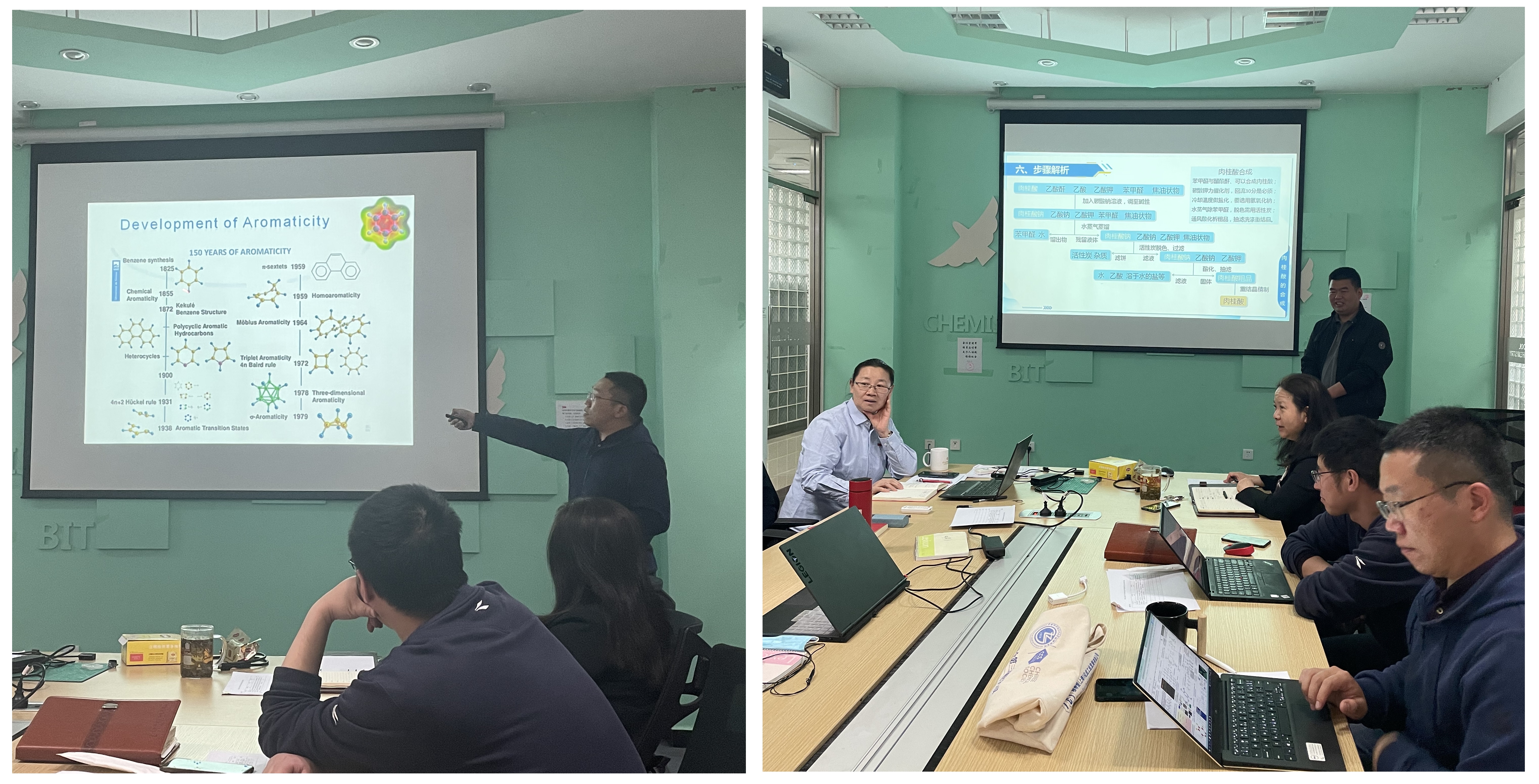 支部大会理论学习与讨论结束后,下午13:10开始,进行青年教师基本功比赛所内选拔赛,有幸邀请到北京市高等学校教学名师奖获得者—李晖老师作为评审专家组的组长。尹晓东选择专业基础课《有机化学》中的“Aromatic Hydrocarbons and Aromaticity”一节,用全英文讲解了芳香化合物的芳香性,内容从基础到前沿广博详实,英文讲解清晰流利;金旭辉讲授《有机化学》中“芳香性杂环化合物”一节,教学内容丰富,讲课过程紧密联系科技前沿,娓娓道来,引人入胜;高广鹏讲授《有机化学》中“芳环取代基的定位效应”一节,尽管是第一次讲授理论课知识,讲解清晰生动;安桥石讲授了《有机化学实验》中“肉桂酸的合成实验”,讲课时风格稳健,淡定从容。李晖老师及各位评委老师对选手讲课的优点予以肯定,并一对一地对选手们的讲课内容、知识点、课程思政点以及课件PPT等提出很多建设性的意见和建议,勉励青年教师重视教学,做好教学和科研的结合,基础知识和学科前沿相结合,以青年教师教学基本功大赛为契机,努力提高教育教学水平,更好地为党育人、为国育才。