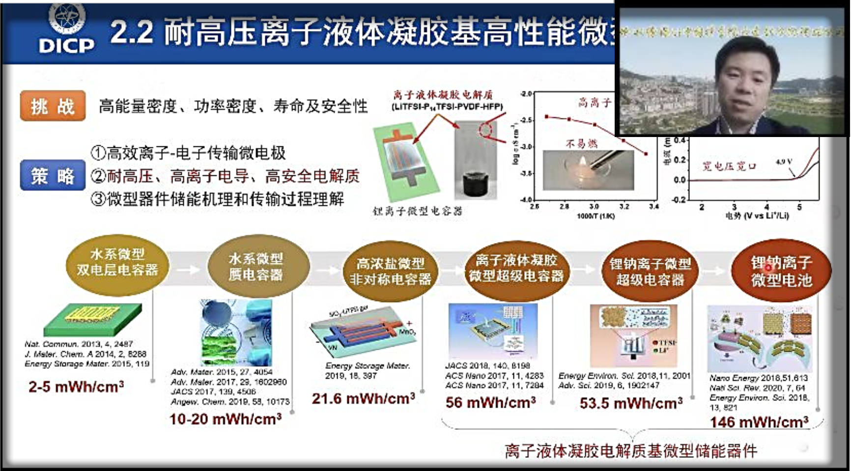 吴忠帅教授针对可穿戴与微电子系统储能器件的重大需求,报告人围绕微型电化学能源材料理性设计与器件构筑的关键科学问题开展了系统研究,取得了一系列研究进展:(1)提出了二维结构界面化学组装与有序介孔精准调控的策略,研制出与平面器件特性相匹配的高活性二维赝电容材料;(2)制备出高效电子-离子输运的图案化微电极,研制出与微电极匹配的高压凝胶电解质,建立了微电极-电解质强界面作用规律,获得了高比能、高功率微型储能器件,揭示了离子多方向传质机制;(3)提出了功能导向一体化设计、复杂多界面协同耦合与调控策略,实现了输出电压和容量可调,研制出大于100 V的微型超级电容器模块,创制出柔性化、集成化等多功能微型储能器件。