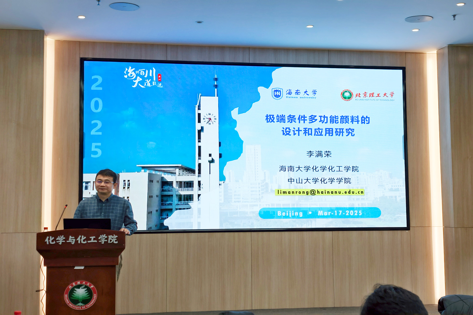 应北京理工大学化学与化工学院邀请,海南大学李满荣教授于2025年3月17日10:00做客北理工“21世纪学科前沿”系列论坛,为我院广大师生带来题为“极端条件多功能颜料的设计和应用研究”的精彩学术报告。本次报告在生态楼118报告厅进行,由杨国昱老师主持,近四十名化院师生参加了报告。